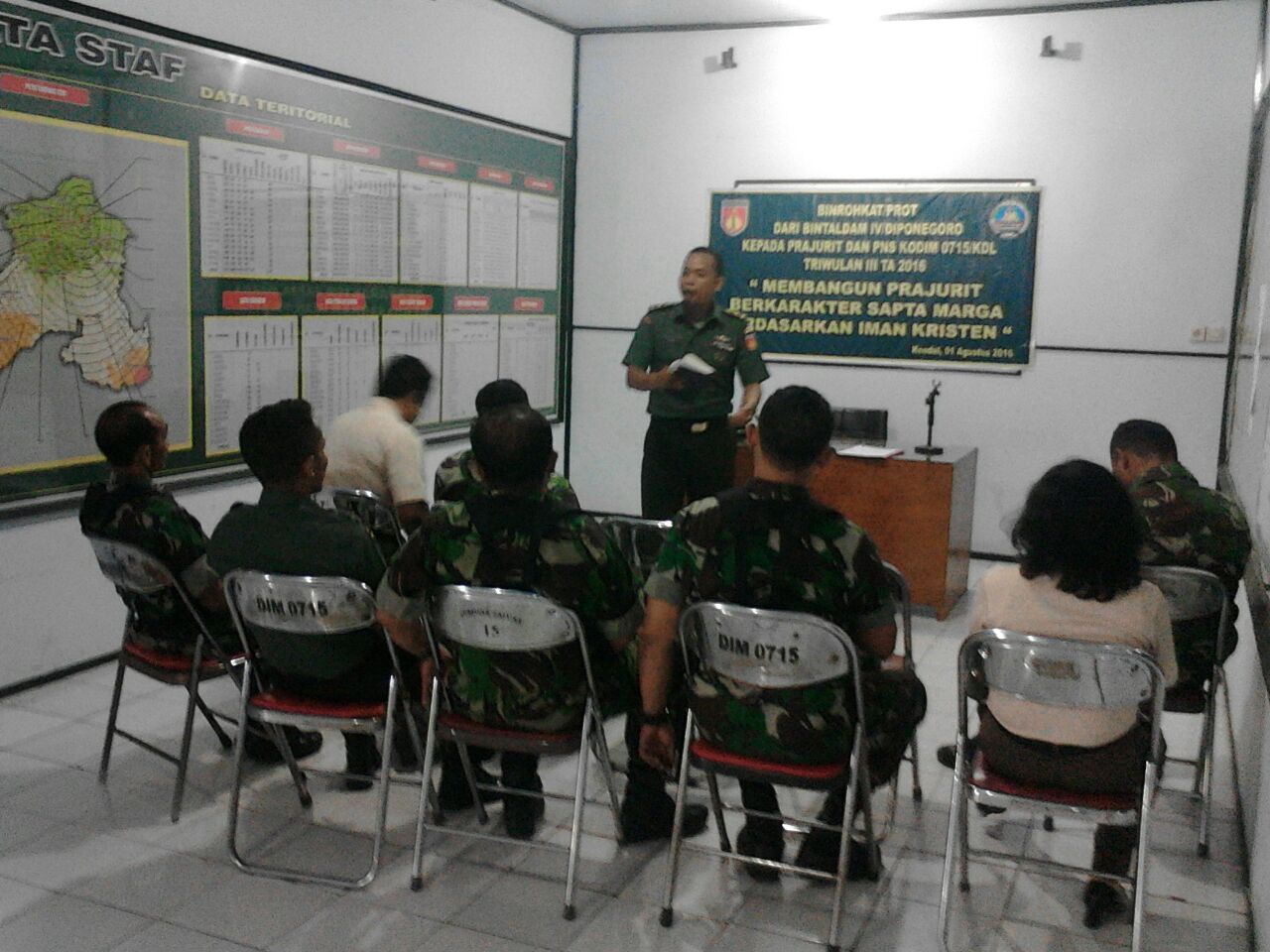 Kendal - Kegiatan Bintalid Juang dari Bintaldam IV/Diponegoro di Kodim 0715/Kendal digelar di Aula Makodim, Senin (1/8). kegiatan tersebut adalah diikuti oleh seluruh prajurit dan PNS Kodim 0715/Kendal. Tujuanya dalam rangka pekan pembinaan mental terpadu yang di programkan oleh Bintal Kodam IV/Diponegoro. Bintalid Juang dari Bintaldam IV/Diponegoro triwulan III tahun anggaran 2016 itu, dibuka Kasdim Kodim 0715/Kendal, Mayor Arn Ir Tri Winarno mewakili Dandim Letkol Inf Piter Dwi Ardianto. Adapun pematerinya, merupakan tim penceramah dari Bintaldam IV/Diponegoro, yakni, pemateri Bintalid Juang, Kapt Kav Sumitro A Alfian ST dengan tema, "Menangkal Bahaya Laten dan Radikal" dan pemateri Bin Rohis, Mayor Inf Imam S.Ag, temanya, "Mengapa Manusia Harus Beribadah pada Allah SWT".Selanjutnya pemateri Bin Rohkat/Prot, Mayor Inf R Hendro Prapto Mukti SSp, dengan tema "Membangun Prajurit Berkarakter Sapta Marga Berdasarkan Iman Kristen". Adapun pelaksanaan pembinaan mental Rohis bertempat di Aula Makodim 0715/Kendal. Sedangkan untuk pembinaan mental Rohkat/Prot di ruang data Kodim.