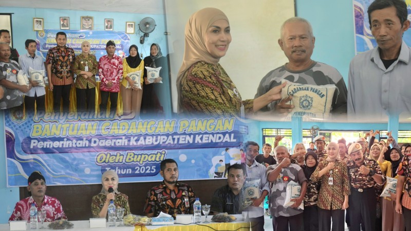 Kendal- Bupati Kendal, Hj. Dyah Kartika Permanasari serahkan bantuan cadangan pangan kepada warga Desa Kartika Jaya, Selasa (1/7/2025) di aula Balai Desa Kartika Jaya Kecamatan Patebon.