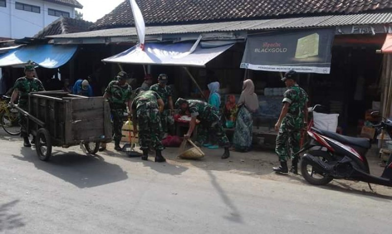 KENDAL - Sejumlah anggota TNI Koramil 06/Gemuh melakukan karya bhakti membersihkan Pasar Tradisional Desa Galih, di Desa Galih, Kecamatan Gemuh, Kabupaten Kendal, dari berbagai macam jenis sampah, Jumat (25/8) pagi. Karya...