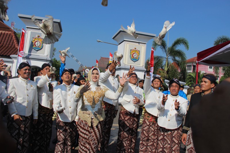 Bupati Kendal Mirna Annisa dan Wakil Bupati Masrur Masykur serta Forkopimda, usai pelaksanaan upacara puncak peringatan hari jadi Kabupaten Kendal ke 411 di alun-alun Kendal Kamis (28/7), melakukan pelepasan merpati putih...