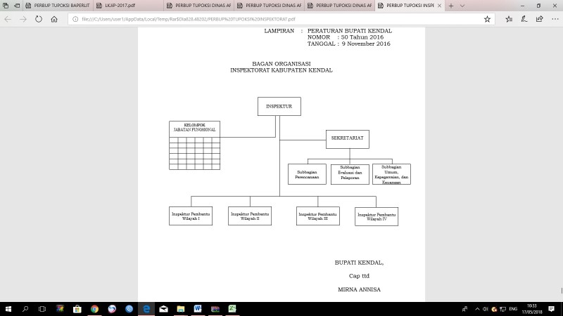 Sebagai salah unsur pengendali dan pembina dan sekaligus konsultan, Inspektorat Kabupaten Kendal dibentuk berdasarkan Peraturan Daerah Kabupaten Kendal Nomor 8 Tahun 2016 tentang Pembentukan dan Susunan Perangkat Daerah Kabupaten Kendal (Lembaran Daerah Kabupaten Kendal Tahun 2016 Nomor 8 Seri D No. 1, Tambahan Lembaran Daerah Kabupaten Kendal Nomor 159) dan Peraturan Bupati Kendal Nomor 50 Tahun 2016 tentang Kedudukan, Susunan Organisasi, Tugas dan Fungsi, Serta Tata Kerja pada Inspektorat Kabupaten Kendal ( Berita Daerah Kabupaten Kendal Tahun 2016 Nomor 50 Seri D No. 5);