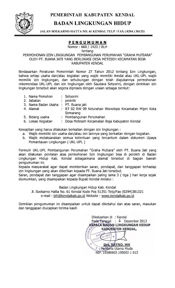 PERMOHONAN IZIN LINGKUNGAN PEMBANGUNAN PERUMAHAN "GRAHA MUTIARA" OLEH PT. BUANA JATI