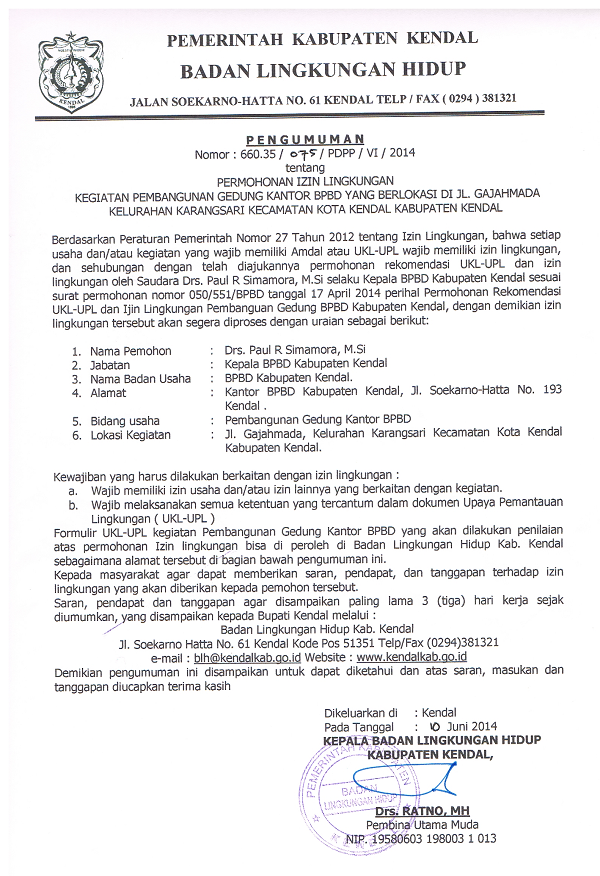 Permohonan Izin Lingkungan Kegiatan Pembangunan Gedung Kantor BPBD Kabupaten Kendal
