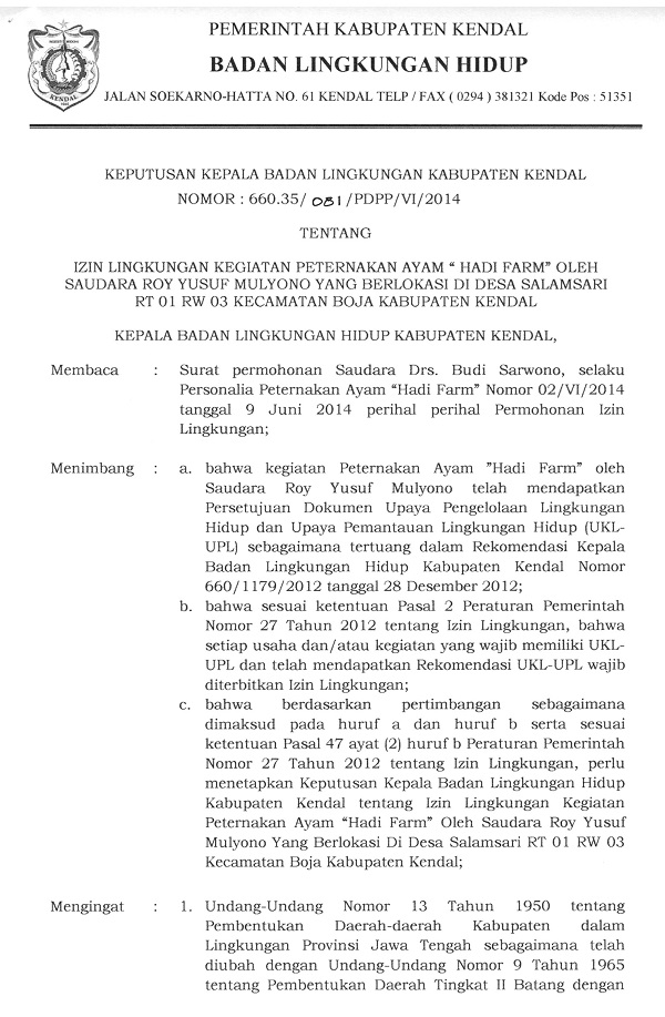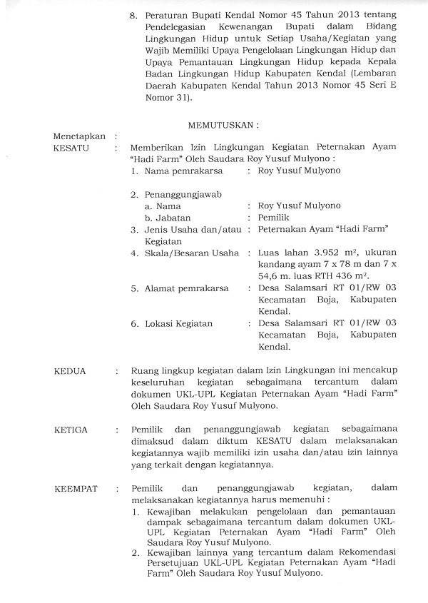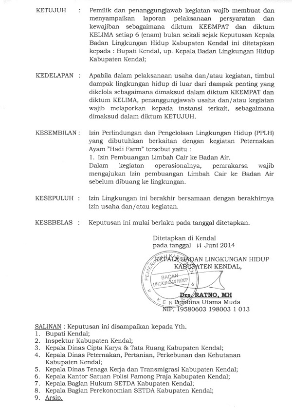 Izin Lingkungan kegiatan Peternakan Hadi farm