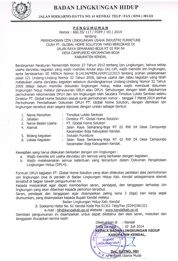 Permohonan Izin LIngkungan Industri Furniture Oleh PT. Global Home Solution