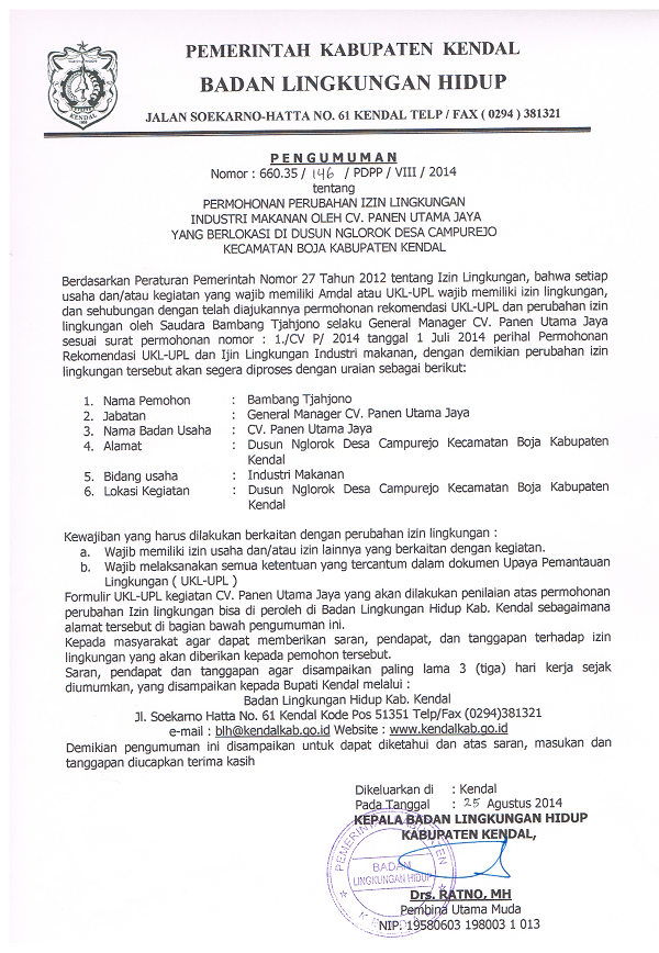 Permohonan Perubahan Izin Lingkungan Industri Makanan CV. Panen Utama Jaya