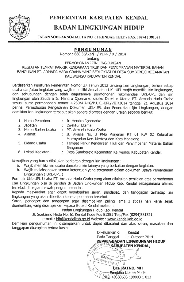 Permohonan izin lingkungan PT. Armada Hada Graha Desa Sumberejo Kaliwungu