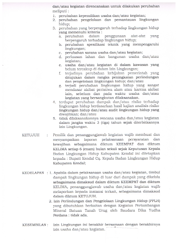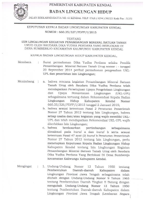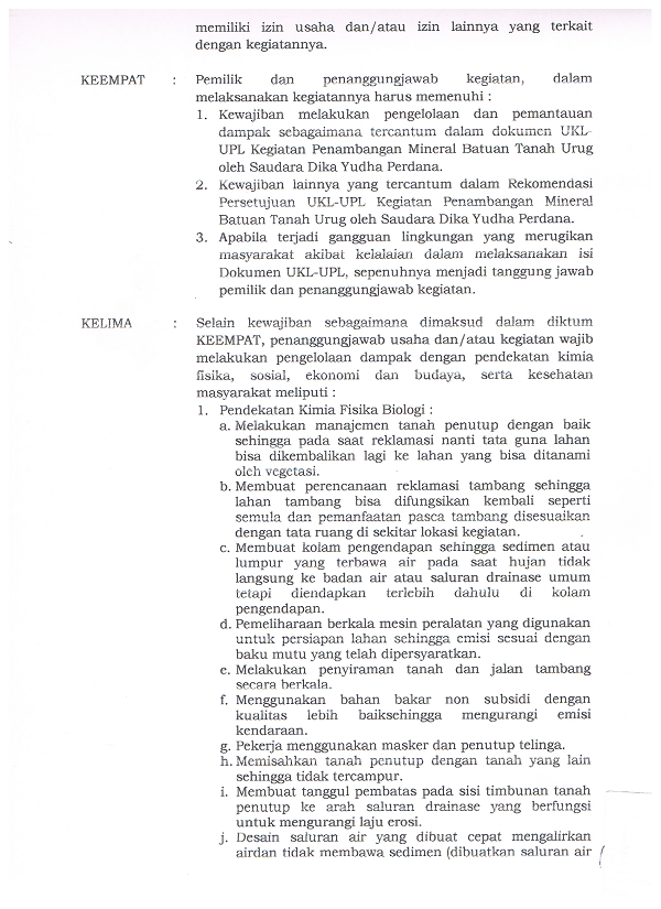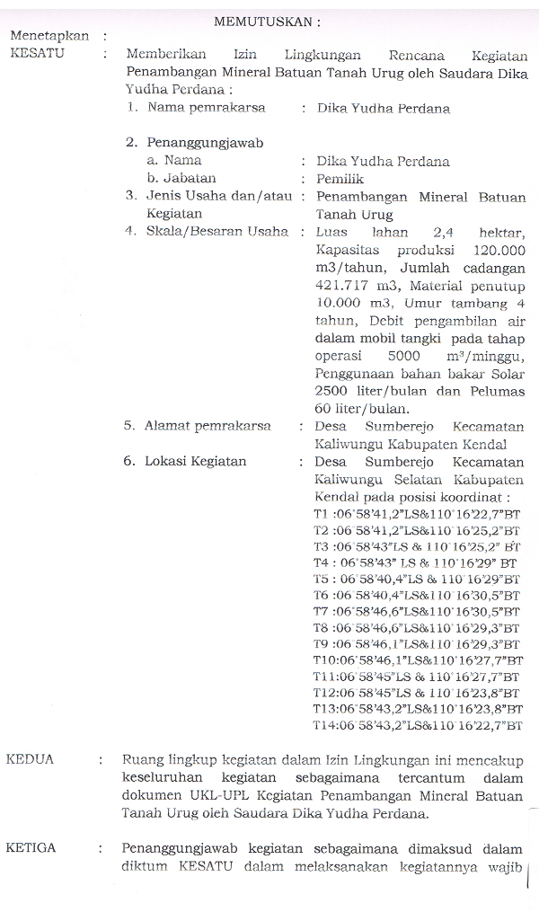 Izin Lingkungan Kegiatan Penambangan Oleh Sdr. Dika Yudha Perkasa