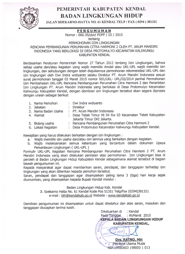 Permohonan izin Lingkungan PT. Arum Mandiri Indonesia Desa Protomulyo Kec. Kaliwungu