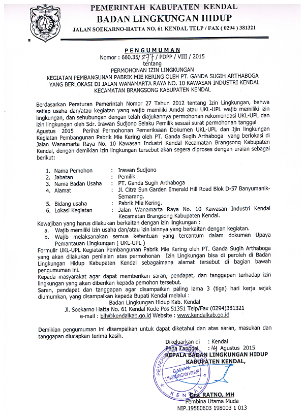 Pengumunan Permohonan Izin Lingkungan PT. Ganda Sugih Arthaboga