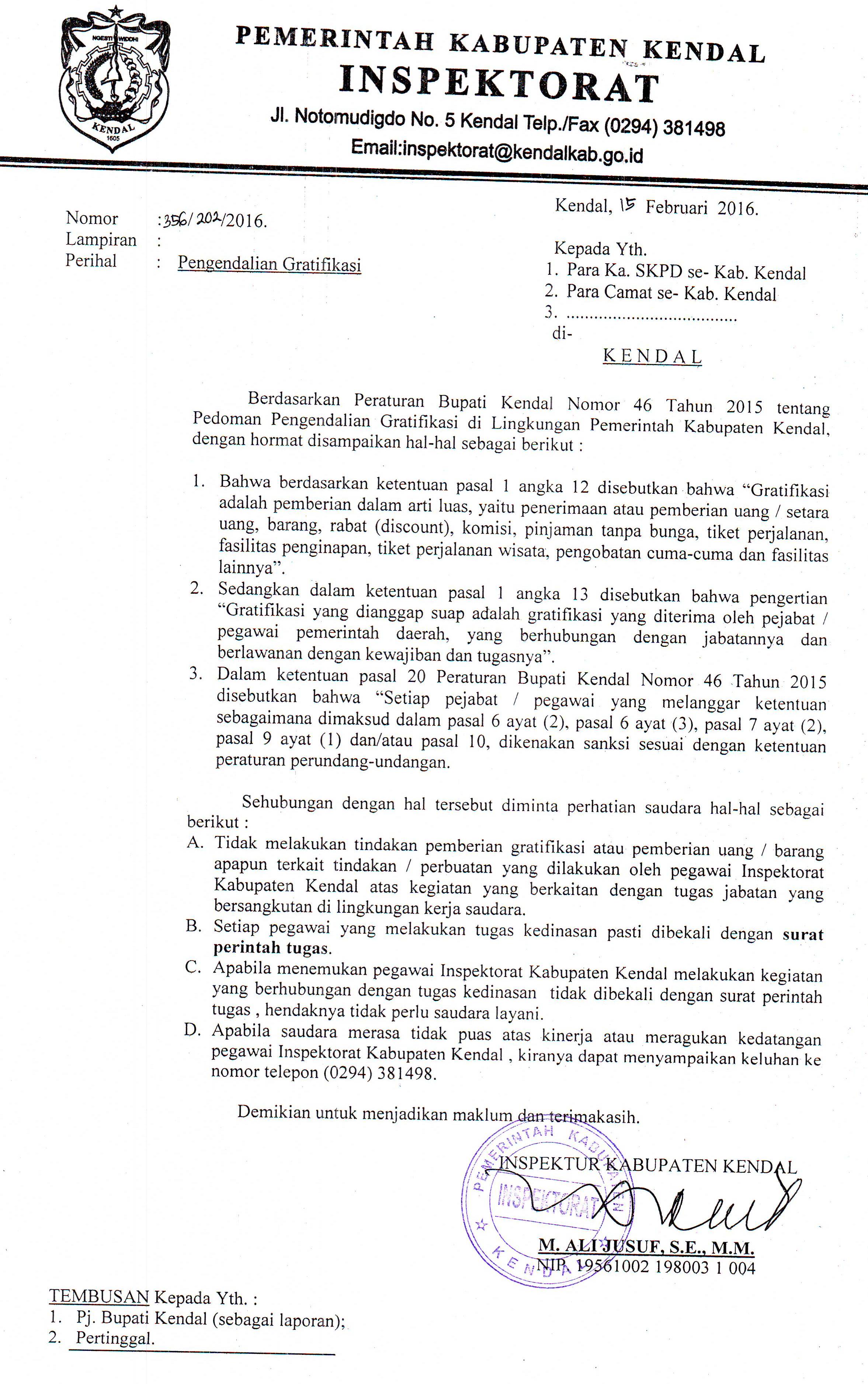 - Apabila menemukan pegawai Inspektorat Kabupaten Kendal melakukan kegiatan yang berhubungan dengan tugas kedinasan tidak dibekali dengan surat perintah tugas, hendaknya tidak perlu saudara layani;