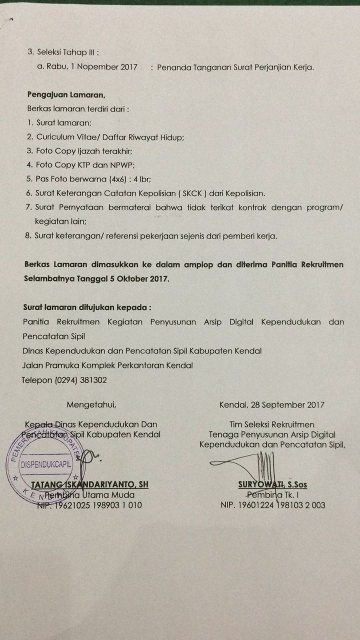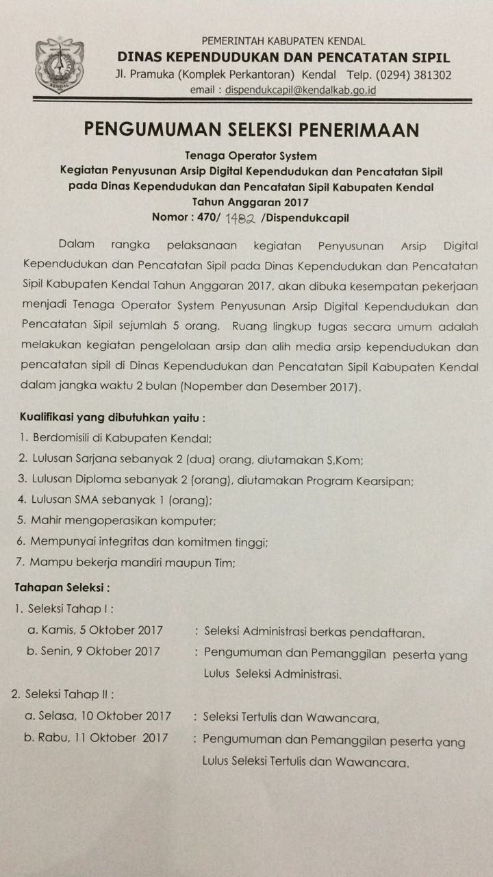 Dalam rangka pelaksanaan kegiatan penyusunan Arsip Digital kependudukan dan pencatatan sipil pada Dinas Kependudukan dan Pencatatan Sipil Kabupaten Kendal pada tahun anggaran 2017. akan dibuka kesempatan pekerjaan menjadi tenaga operator sistem penyusunan arsip Digital kependudukan dan Pencatatan sipil.