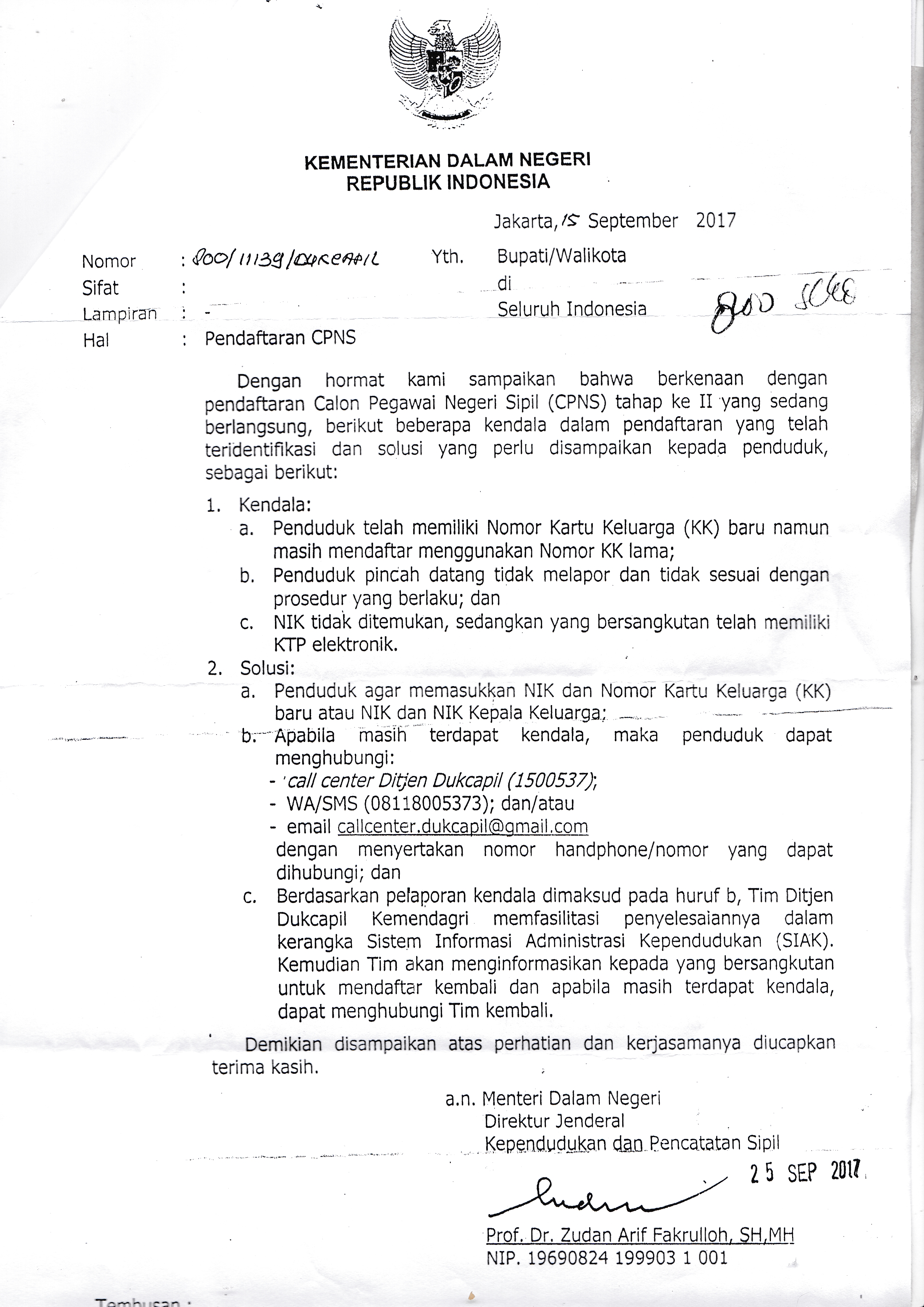 Bersama ini kami sampaikan Surat Edaran dari Menteri Dalam Negeri Republik Indonesia Nomor:800/11139/DUKCAPIL tanggal 15 Septrember 2017 tentang tersebut pada pokok surat terkait beberapa kendala dalam pendaftaran Calon Pegawai Negeri Sipil Tahap II Tahun 2017, Sebagaimana terlampir;