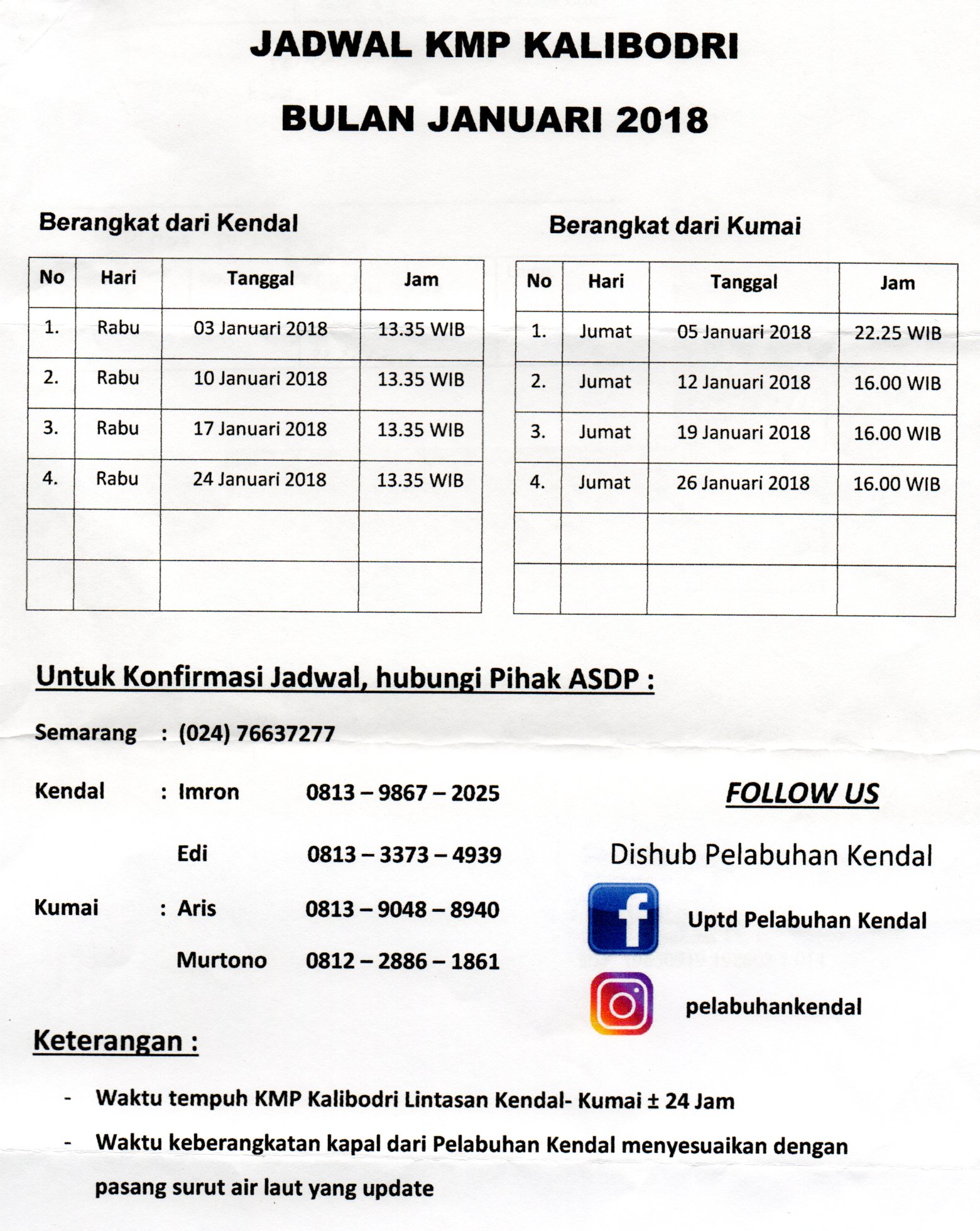 Berikut Jadwal KMP Kalibodri Bulan Januari 2018.