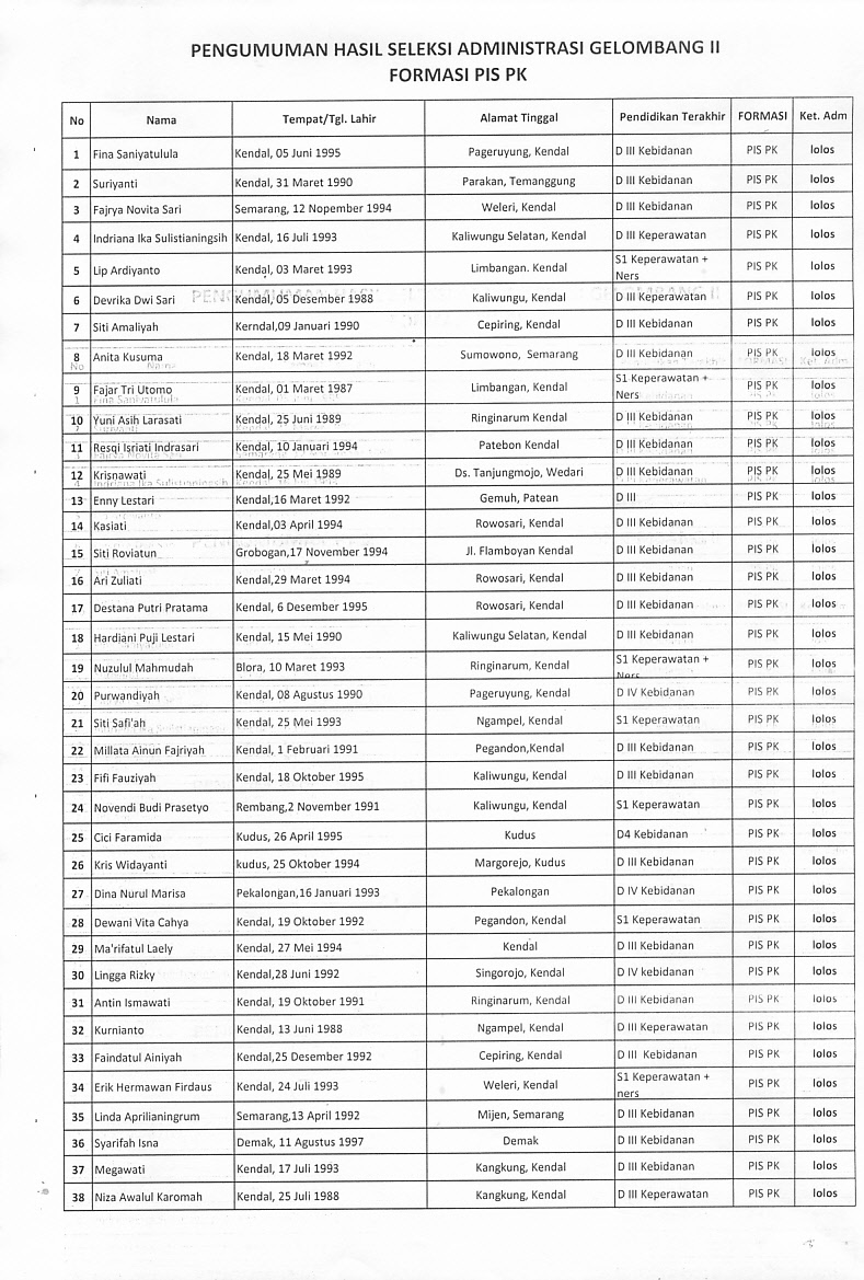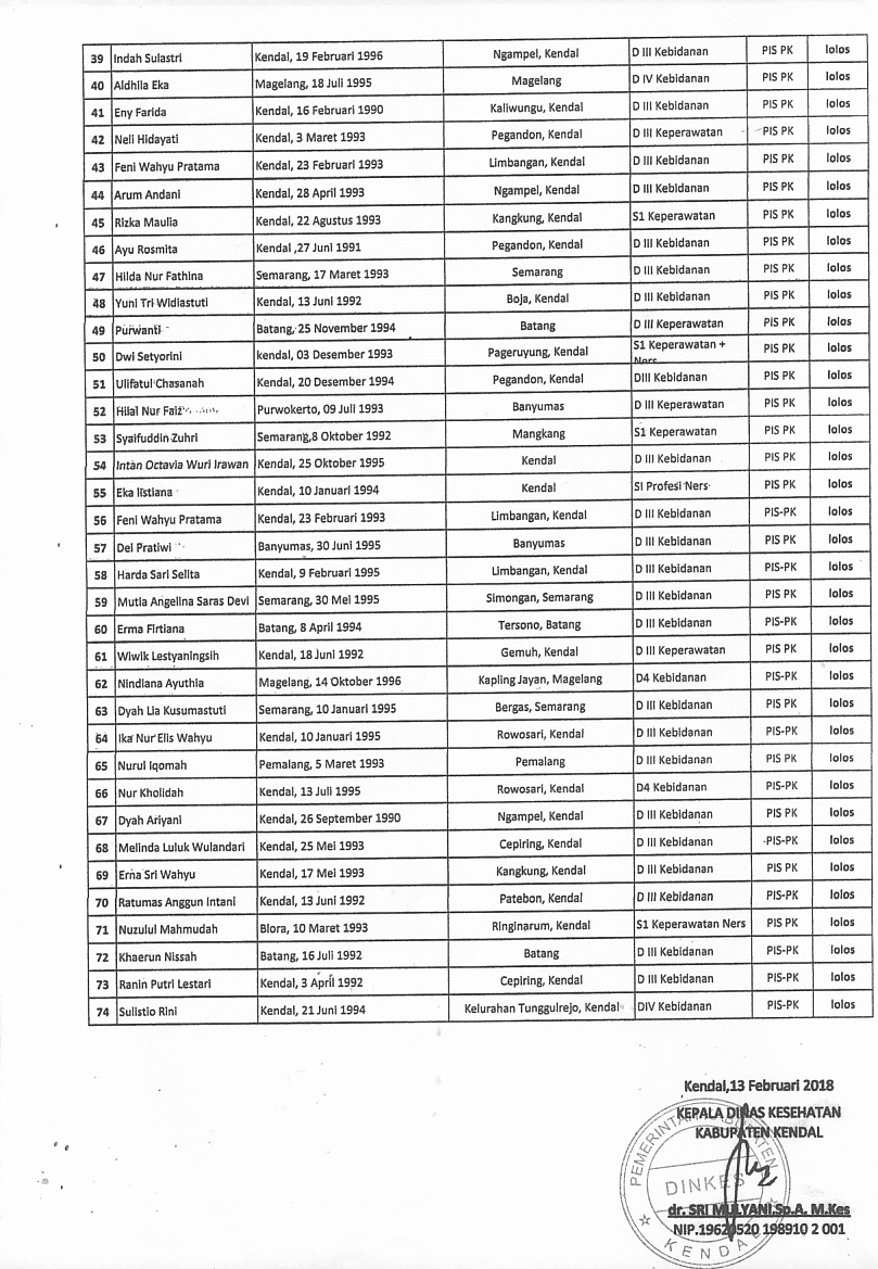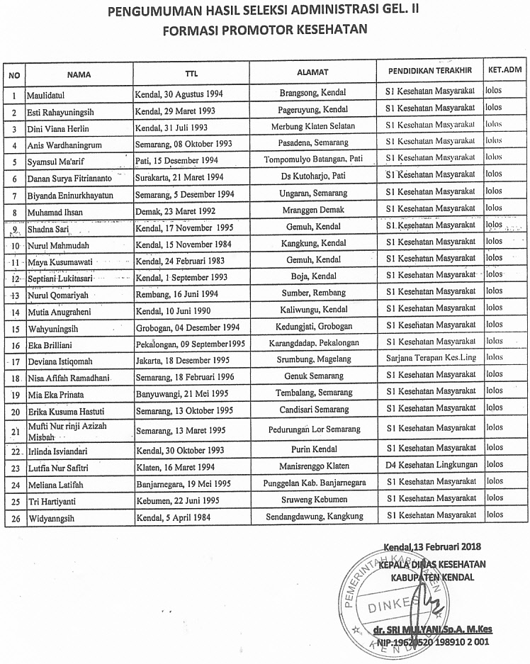 untuk yang lolos administrasi bisa mengambil kartu tes besok Hari Kamis, Tgl. 15 Februari 2018 di Dinas Kesehatan Kab.Kendal pada Jam Kerja. Terima kasih