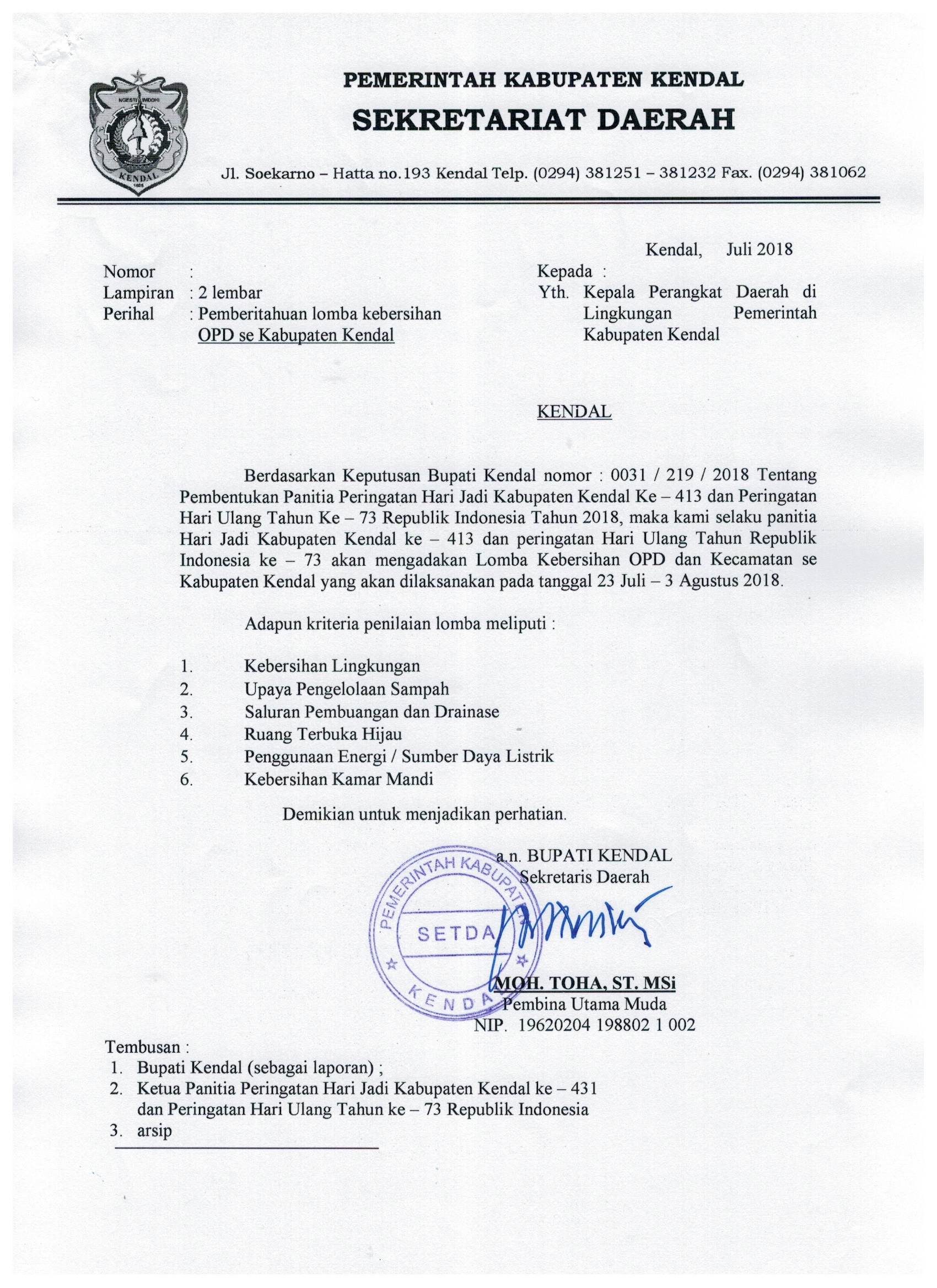 PENGUMUMAN PEMBERITAHUAN LOMBA KEBERSIHAN OPD se KABUPATEN KENDAL DALAM MEMPERINGATI HARI JADI KABUPATEN KENDAL KE - 413 DAN PERINGATAN HARI ULANG TAHUN KE - 73 REPUBLIK INDONESIA